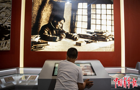 7月7日,中国人民抗日战争纪念馆,一位小参观者通过屏幕翻阅《论持久战》并答题互动。中青报·中青网记者 李峥苨/摄