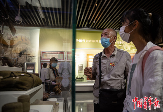7月7日,中国人民抗日战争纪念馆,66岁的老军人王世保为15岁的孙女王彬悦讲解八路军第129师骑兵团的故事。中青报·中青网记者 李峥苨/摄