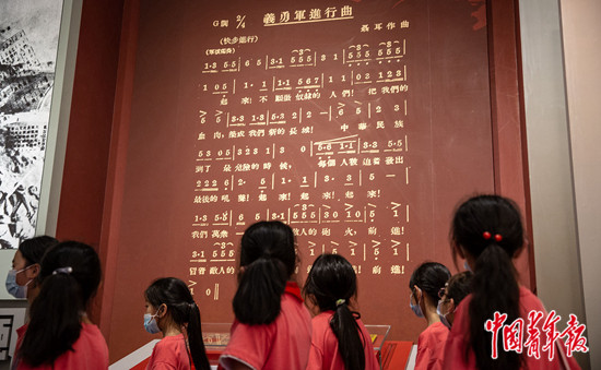 7月7日,中国人民抗日战争纪念馆,观众在《义勇军进行曲》的简谱前驻足。中青报·中青网记者 李峥苨/摄