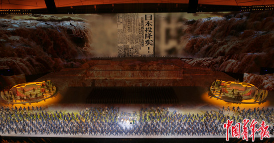 庆祝中国共产党成立100周年文艺演出《伟大征程》现场,情景大合唱《怒吼吧 黄河》,表现出团结抗日的民族气魄。中青报·中青网记者 陈剑/摄