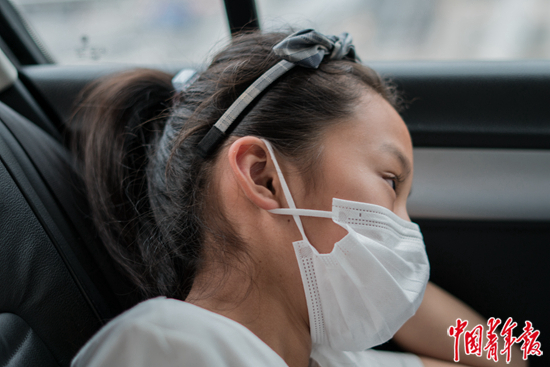 7月26日,返程去火车站的路上,小芜正看着车前的路出神。妈妈说,女儿有点晕车,而且有些不想离开。 实习生 王一凡/摄