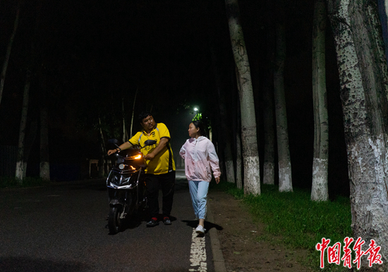 7月18日晚上,北京市顺义区河北村,结束了一天的职业体验后,奥奥跟着爸爸在夜色中回家。