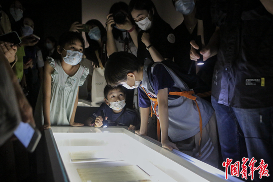 几名小观众正打着手电筒观看梁思成绘制的建筑手稿。
