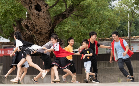 8月26日,江西新余仙女湖区河下镇平川村,孩子们与党员和青年志愿者进行户外游戏。每逢暑期,河下镇通过村委“党建+成长之家”活动中心,为少年儿童提供阅读、书法、绘画、体育运动等丰富多彩的活动。赵春亮/视觉中国