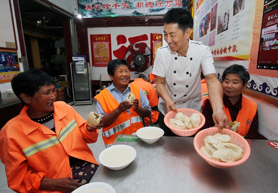 8月26日,山东潍坊青州市,石福军将刚出锅的包子送到前来就餐的环卫工人桌前。石福军自2014年包子铺开业起,坚持为当地环卫工人免费提供早餐,已送出了8万多个包子。张驰/视觉中国