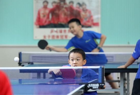 7月30日,石家庄市和平西路小学乒乓球馆,小学员正在进行乒乓球训练。