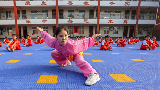 8月21日,河北省邯郸市,暑期,鸡泽县中小学生在教练带领下练习二郎拳。本版图片由视觉中国供图