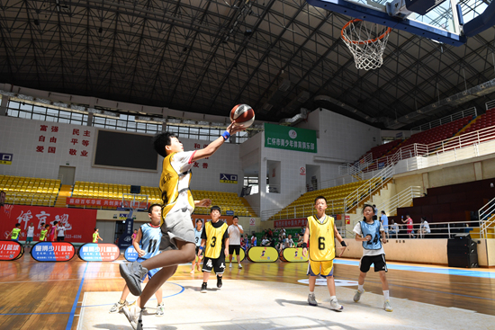 8月21日,暑假期间,贵州省仁怀市热爱篮球的孩子利用假期参加篮球技能训练,进行三对三篮球赛检验训练成果。