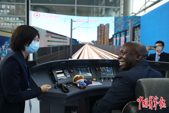10月14日,北京国家会议中心,来自加纳的外宾塞德里克体验京张高铁模拟驾驶。当日,第二届联合国全球可持续交通大会在这里开幕。会场外的主题展览吸引众多中外嘉宾观看。