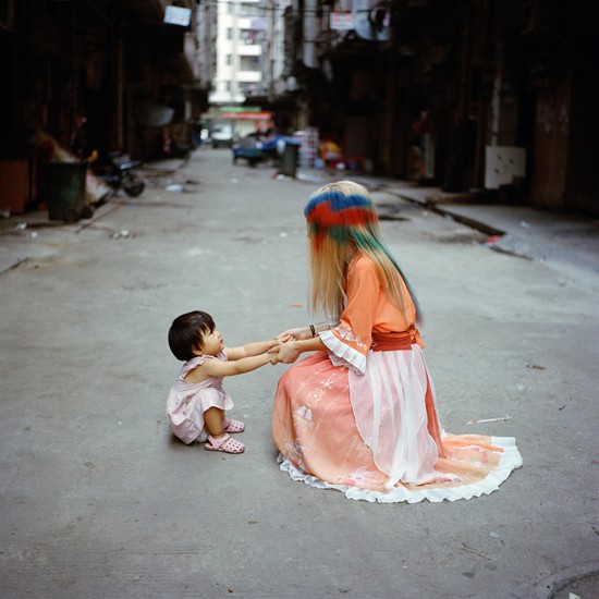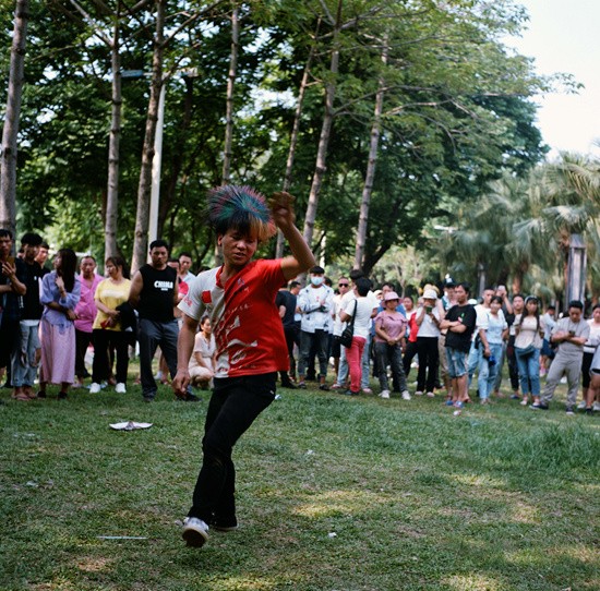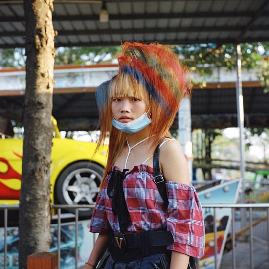 2019年12月1日,广东省东莞市石排镇石排公园,小兰来到公园和朋友一起“炸街”,色彩亮丽的造型吸引了许多人的围观和搭讪。为补贴家用,她从老家云南来到石排镇的一家玩具厂打工。受身边朋友的影响,她接触到“杀马特”文化并开始学习打扮。对很多彩发青年来说,这种夸张的造型使他们从人群中脱颖而出,吸引更多人的关注,也让他们获得自信与活力,那是在工厂流水线工作中从未体验过的快乐与自由。