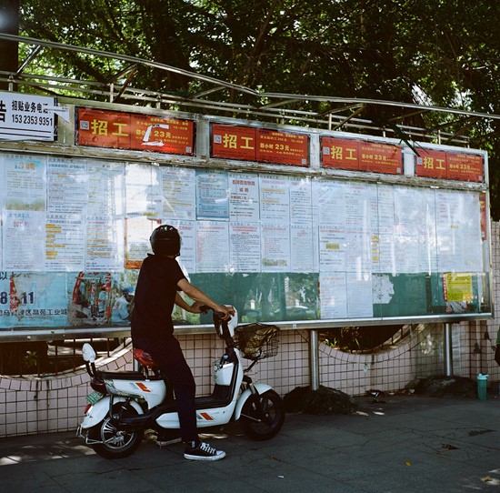 8月30日,广东省东莞市石排镇,镇中心人流密集的十字路口,一块公告栏上贴满各家工厂的招工信息,吸引了一名路人驻足。在石排镇,这样的招工信息随处可见,“日结工资”“包吃包住”“做事轻松”是经常出现的关键词。