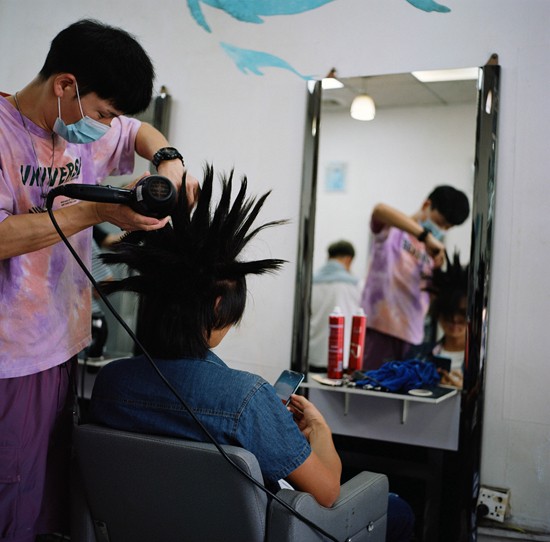 5月1日,广东省东莞市石排镇名流理发店,寒少正在做发型,店员用吹风机和梳子将他的头发往上吹,再将其定型,形成一个个像刺猬刺的尖角。