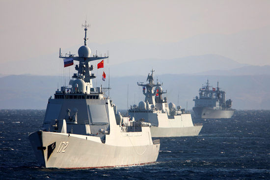 中国海军南昌舰官兵紧盯海空态势。10月17日至23日,中俄两国海军的10艘舰艇、6架舰载直升机组成联合编队,位日本海、西太平洋、东海海域成功组织实施了首次海上联合巡航。