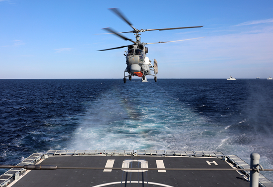 当地时间10月15日,中俄“海上联合-2021”演习,俄方舰载直升机飞临中国海军南昌舰进行模拟着舰演练。