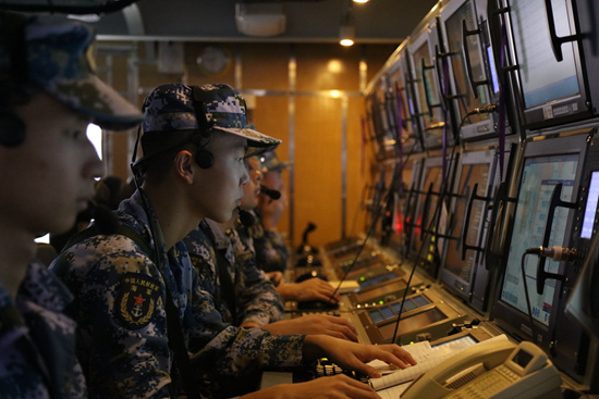 面对外国舰机的跟踪监视,官兵们显得十分淡定,各司其职,一切工作按部署展开,各战位有条不紊地运转着。导航班长吕瑞鹏上士曾20余次远航,他平静地说:“我们已经习以为常了。”言谈举止间透着一股大国水兵的自信和从容。