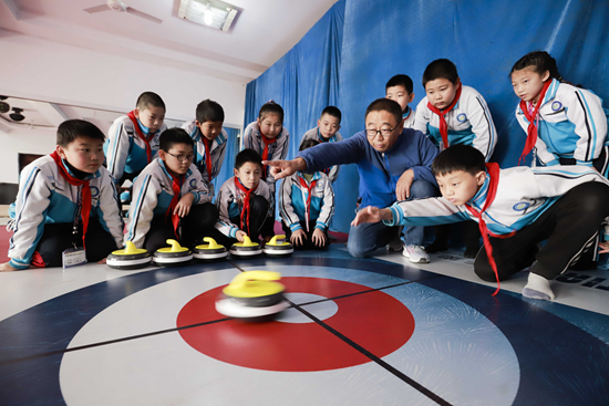 10月29日,河北省遵化市第三实验小学的老师指导学生投掷陆地冰壶。 刘满仓/摄(新华社发)