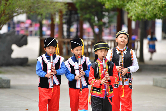 10月27日,在广西融安县第二实验小学,学生们在吹奏民族乐器——巴乌。 新华社记者 黄孝邦/摄