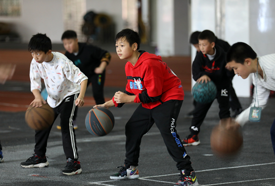 10月29日,湖南省资兴市鲤鱼江完全小学,学生练习篮球。 李科/摄(新华社发)