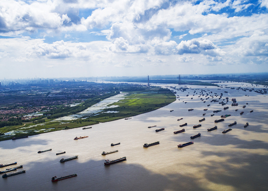 船舶在湖北省武汉市阳逻港区水域行驶(2018年8月13日摄,无人机照片)。 新华社记者 肖艺九/摄