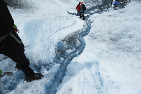 当地时间2015年11月30日,阿根廷圣克鲁斯省,爱好者在莫雷诺冰川徒步。全球变暖致使部分冰川融化。 视觉中国供图