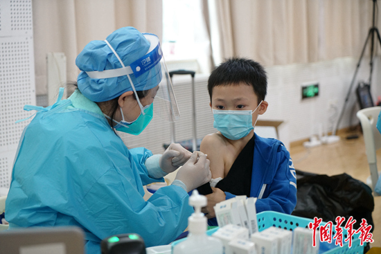 11月9日,北京,一名小学生在接种疫苗。当日,首都师范大学附属朝阳实验小学组织翠北校区在校学生接种第一针新冠疫苗,共完成1115名在校学生的疫苗接种工作。现场工作人员需检查核对家长签字的《接种新型冠状病毒肺炎疫苗知情同意书》和学生的身份证信息,并了解学生最近的身体状况。