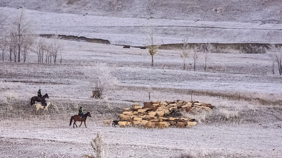 11月6日,新疆伊犁,民警在边境帮助被困牧民及羊群安全转场。近日,伊犁地区出现寒潮降雪和大风天气,给正在冬季转场的霍尔果斯市部分牧民带来了影响。