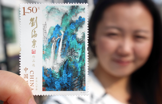 2016年3月16日,一名集邮爱好者在江苏苏州邮政局展示刚购买的《刘海粟作品选》特种邮票之“黄岳人字瀑”。视觉中国供图