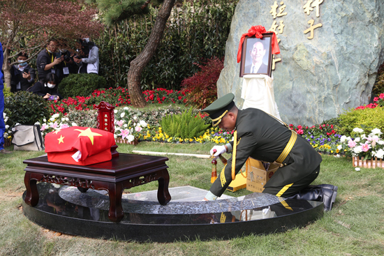11月15日,袁隆平骨灰安葬仪式在湖南长沙唐人万寿园陵墓举行。袁老遗像背后的巨石上,镌刻着他生前写的一句话:人就像种子,要做一粒好种子。视觉中国供图