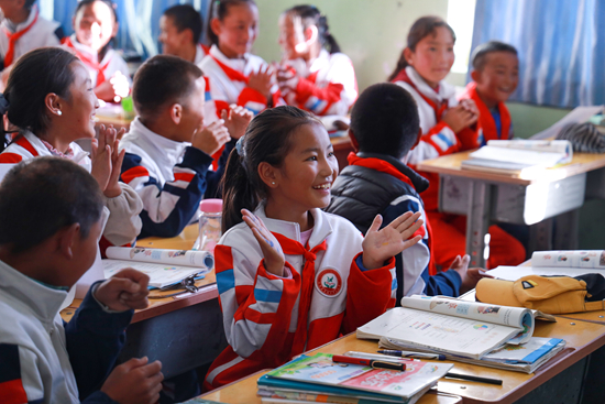 得知“火凤凰”援藏教育关爱队要离开的消息后,西藏康雄乡中心小学的藏族孩子自发组织了一场“送别会”,把关爱队师生拉到操场,跳了一支欢送舞,并送上了写满祝福和感谢的卡片。