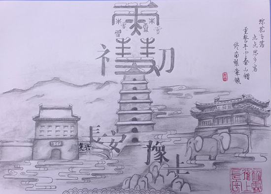 永宁门和大雁塔代表西安,开封府门代表两位作者的故乡河南。朝向开封府方向的高铁代表作者在异地求学对家乡的思念,而朝向西安的两头大象代表离乡求学的状态。将大雁塔放在中间,塔顶与象征着天空的“雪”字交合,代表一点点努力攀爬高峰、艰苦奋斗的态度与决心。上方的“初”字,偏旁化为衣字旁,代表冬衣,“刀”字代表以笔为剑,披荆斩棘的决心。右上角题词为:琼花飞落,点点思乡客。重整平巾秦山错,终南梨棠锁。