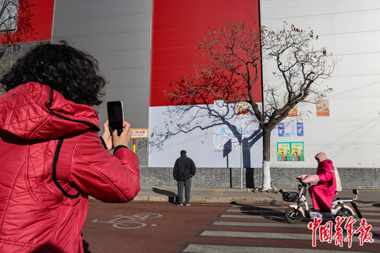 12月1日,北京东直门附近,路人拍摄“网红”树。这棵看似平平无奇的树,因刚好处于围挡外墙红与白的交界处,近日在社交媒体上走红,引来不少人拍照“打卡”。但在没有信号灯的斑马线上拍照,也存在交通安全隐患。据了解,该处围挡是位于东直门的地铁机场线西延工程,2016年开工建设,预计今年年底通车,起点为东直门站,终点为北新桥站,建成后将与地铁5号线联通。12月2日上午,该处围挡已经被贴上宣传海报和白色贴纸,仍有不少人来拍照。