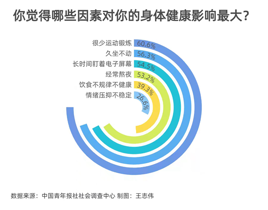 调查显示,60.6%的受访青年认为很少运动锻炼是影响身体健康的重要因素,56.3%的受访青年认为是久坐不动,54.5%的受访青年觉得是长时间盯着电子屏幕。