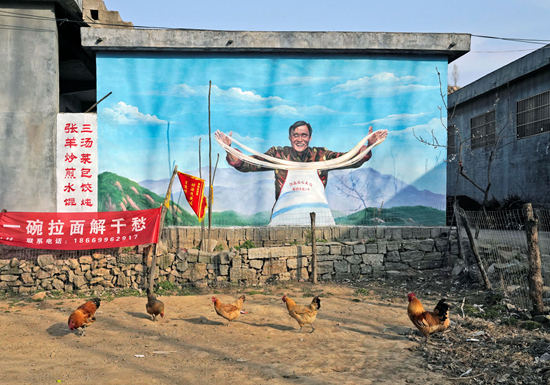 2021年3月24日,山东临沂,“拉面哥”所在的村庄,他的宣传画。视觉中国供图