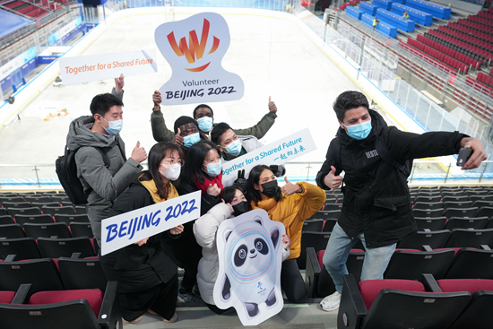 12月30日,参加场馆培训的尼泊尔籍志愿者查理斯(右一)与其他外籍志愿者在北京五棵松体育中心合影。当日,北京五棵松体育中心迎来参加场馆培训的第一批冬奥会志愿者。新华社记者 鞠焕宗/摄