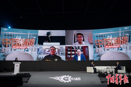 2021年12月26日,北京,第六届“中国制造日”活动现场,主题为“中国制造拓宽边界”的圆桌论坛正在进行,中国铁建大桥工程局桥梁工程专业首席专家樊立龙、东方电气风电股份有限公司副总经理刘世洪、徐工集团工程机械有限公司“神州第一挖”700吨矿用挖掘机总工程师杨裕丰等嘉宾通过现场连线参与讨论。