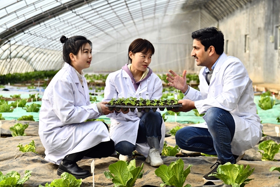 1月7日,在济南市的山东省农科院蔬菜研究所,阿里·安沃(右)和生物技术团队人员在温室大棚里查看白菜杂交育种情况。