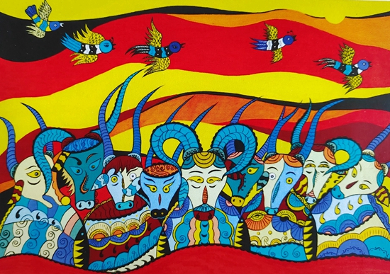 《喜气洋洋》以黄色和红色为主色调,画了5只喜鹊9只羊。姜海杰解释,羊寓意吉祥,喜鹊寓意喜庆,寓意着老百姓的日子越过越好了。“农民画是‘画天、画地、画自己,画山、画水、画乡情’,我想把我看到的农村的变化,用吉祥的动物进行诠释,表达我内心的喜悦。”姜海杰说。
