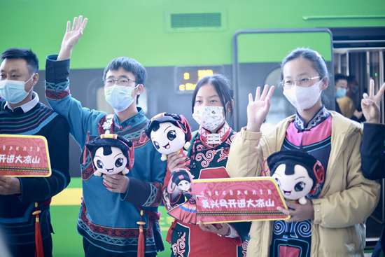 1月10日,四川省米易县,凉山彝族自治州喜德县瓦尔学校的师生们乘坐“复兴号”动车组抵达米易东站后,在站台上和列车合影留念。当天,凉山州首趟“复兴号”动车组从西昌西站开出,标志着大凉山进入动车时代。李欣怡/摄