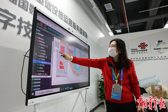 1月10日,北京首钢园,工作人员在展示冬奥场馆资源管理系统的使用。通过这个系统,冬奥场馆内的设备、线路、空间等所有相关的资源都可以可视化、“动”起来。