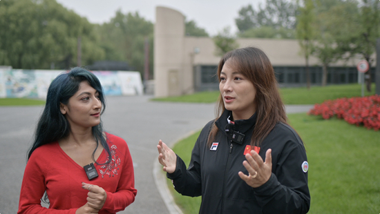 李妮娜(右)在接受“我在中国看冬奥”主持人陶天的采访。视频截图