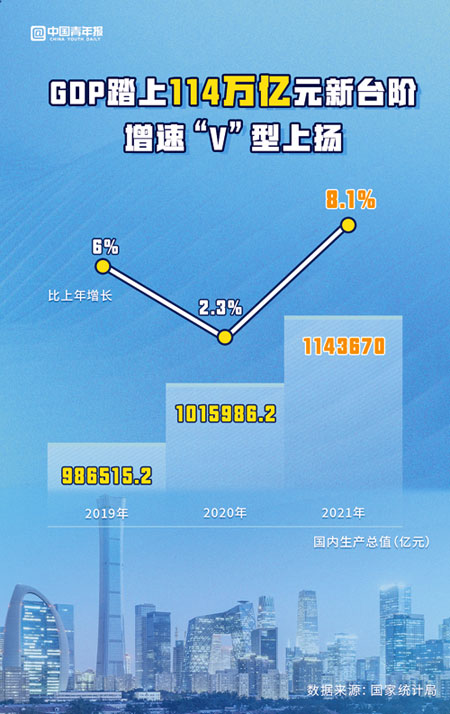 国家统计局17日发布数据,2021年,中国国内生产总值(GDP)为1143670亿元,按不变价格计算,比上年增长8.1%,两年平均增长5.1%,实现“十四五”良好开局。
