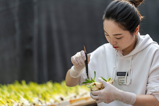 1月16日,在漳州市高新区九湖镇百花村,一名水仙花批发店店主在给水仙花球削叶片。