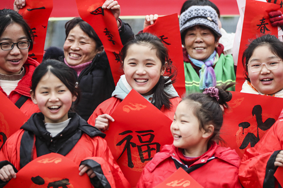 1月19日,在江苏省淮安市清江浦区西安路社区,小学生和社区居民一同展示春联和福字。 赵启瑞/摄(新华社发)