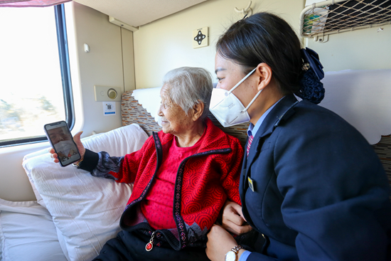 由哈尔滨西开往海口的Z114次列车,因其老年旅客居多,各项服务举措温馨细致,被很多老年旅客亲切地称为“移动敬老院”。图为1月15日哈尔滨旅客刘大娘在Z114次列车上,通过手机视频同老伴儿分享自己的旅途,点赞列车员王文冕。 徐榕泽/摄