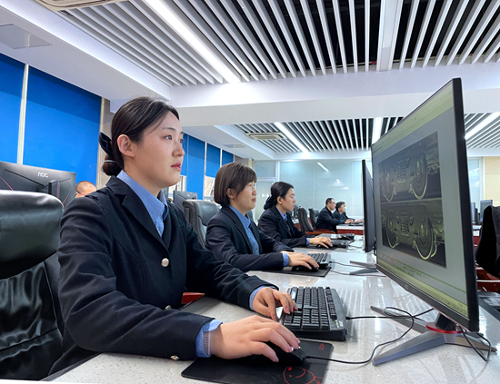 济南西车辆段动态检车员徐佩佩正在利用货车TFDS集中作业平台分析判断铁路货车轮对故障。 徐中秋 高延鹏/摄