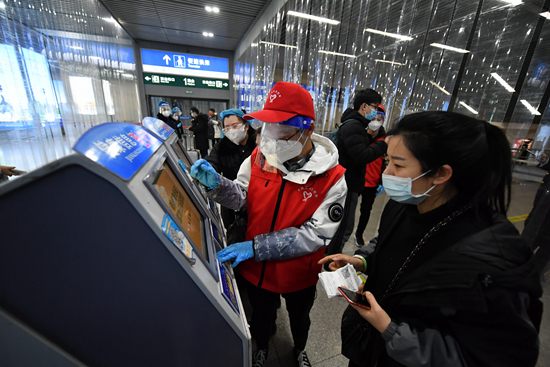 春运首日,太原南站青年志愿者在引导无法正常出示行程码的出站旅客进行信息登记。 赵哲昌/摄