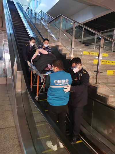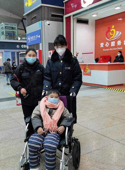 1月18日,北京南站,一位刚做完手术的旅客在润秋服务组工作人员帮助下进站上车。 韩文文/摄
