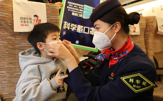 春运第一天,郑州客运段高铁车队二队严格按照防疫要求,做好列车疫情防控,全力为旅客营造安全的乘车环境。图为列车长石甜甜在帮助小旅客佩戴口罩。 张强/摄
