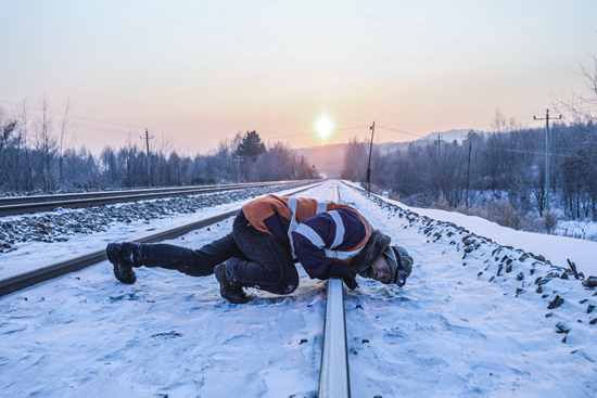 1月17月,绥化工务段朗乡线路车间小白工队工长张海斌带领9名工人,对绥佳铁路168公里192米至173公里间的线路冻害处所进行整治。图为张海斌在查看线路情况。 吴健/摄