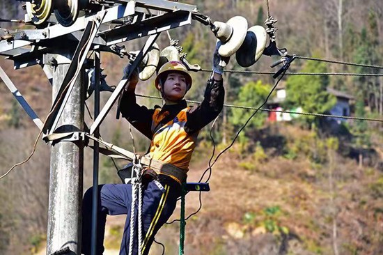春运期间,为确保列车安全运行,巴山腹地襄渝铁路线上的电力工要对铁路供电设备设施提前进行检修,确保设备运行良好。图为中国铁路西安局安康供电段电力运维工区女职工王雯在襄渝铁路线上检修供电隔离开关。 杨精铨 李珂 于海/摄